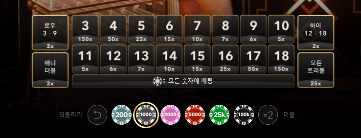 - 하이/로우 (High/Low) – 합이 12~18 또는 3~9일 경우 선택